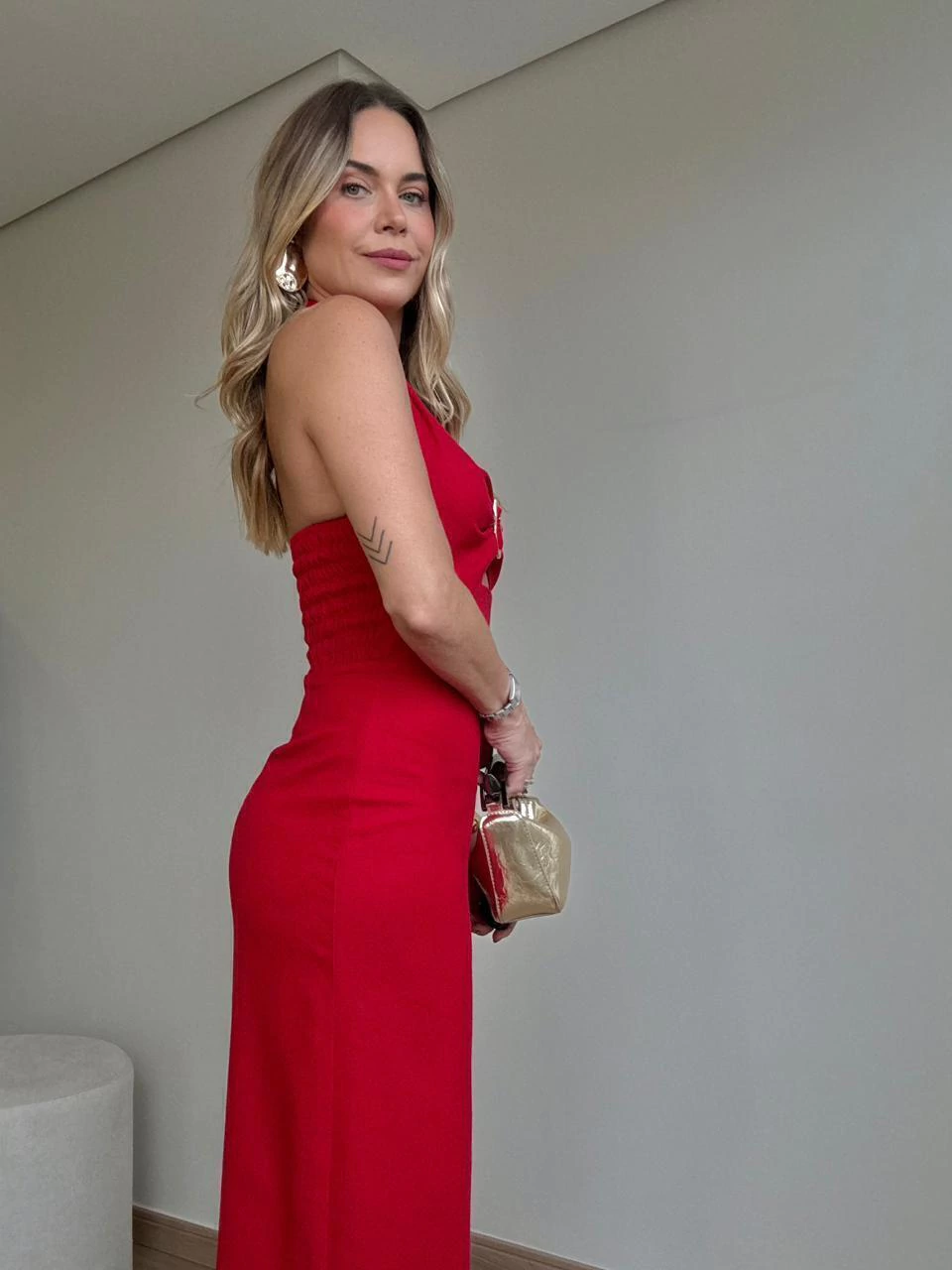 Confeccionado em viscolinho, o vestido Agnes possui busto estruturado com delicado detalhe dourado, realçando sua sofisticação. A pequena abertura abaixo do busto e a alça frente única de amarração conferem charme único, enquanto o elástico e zíper nas costas garantem ajuste perfeito. A fenda na parte de trás adiciona movimento.