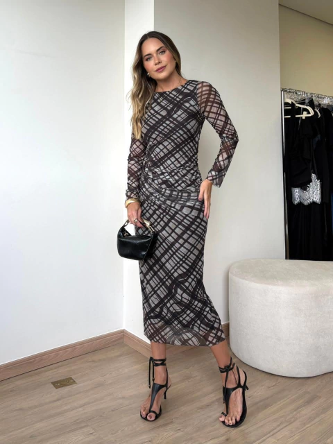 O Vestido Charlotte, confeccionado em tule xadrez com drapeado delicado na cintura, valoriza a silhueta com um toque moderno e elegante. Seu forro garante conforto e caimento impecável, ideal para ocasiões especiais que pedem um visual refinado e atemporal.